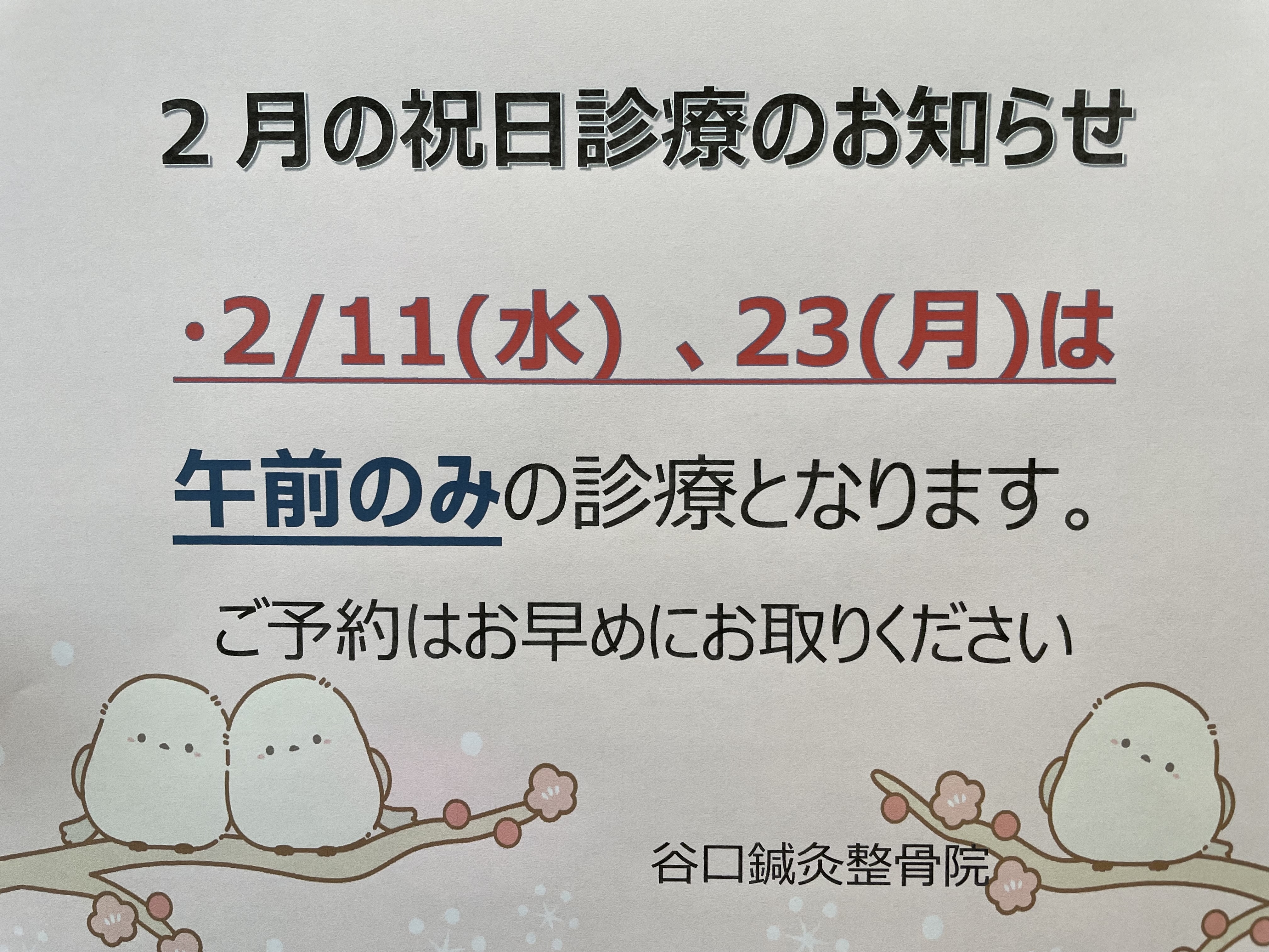 2月11日(水)、2月23日(月)は通常通りの午前診療となります。